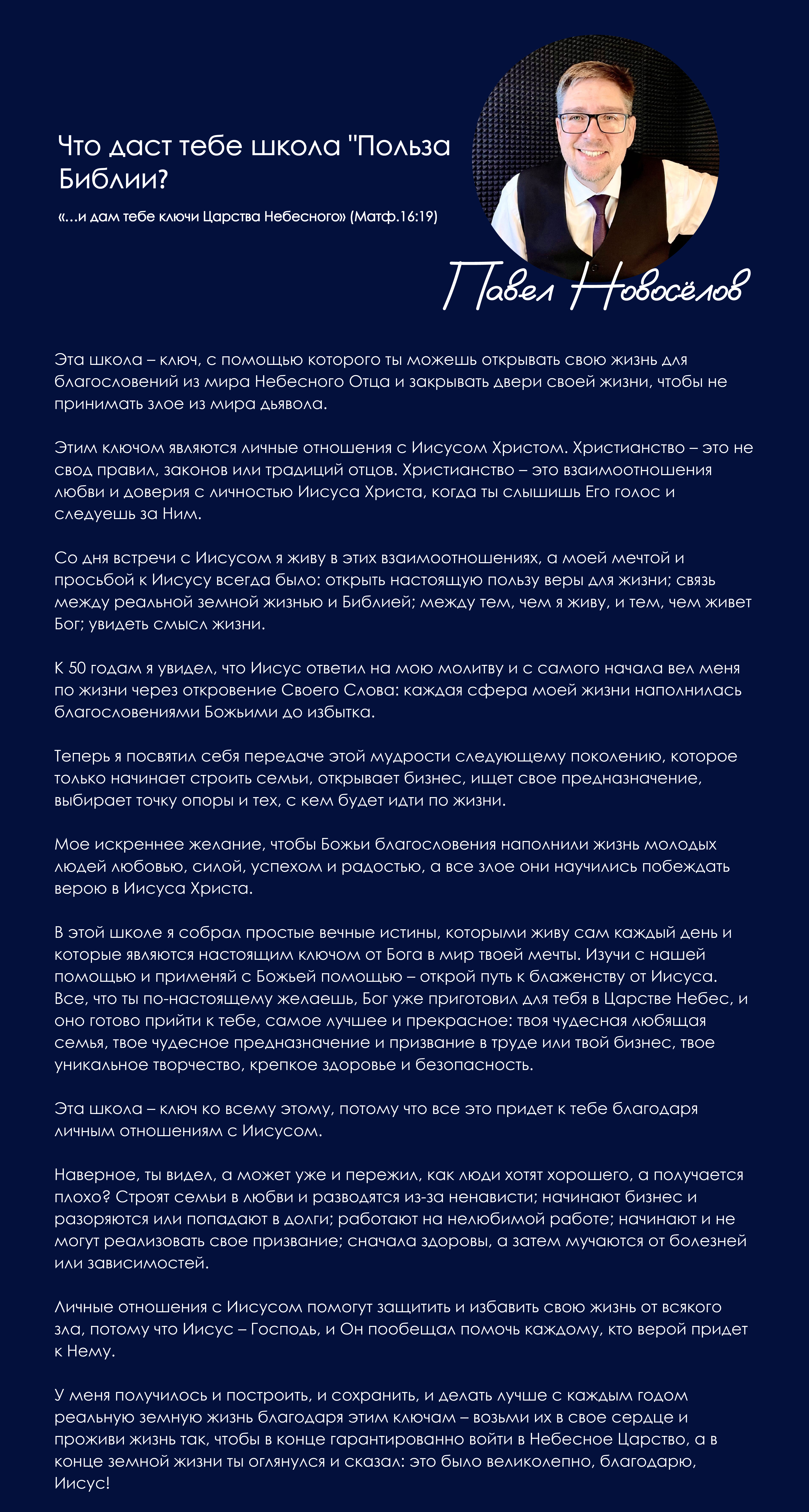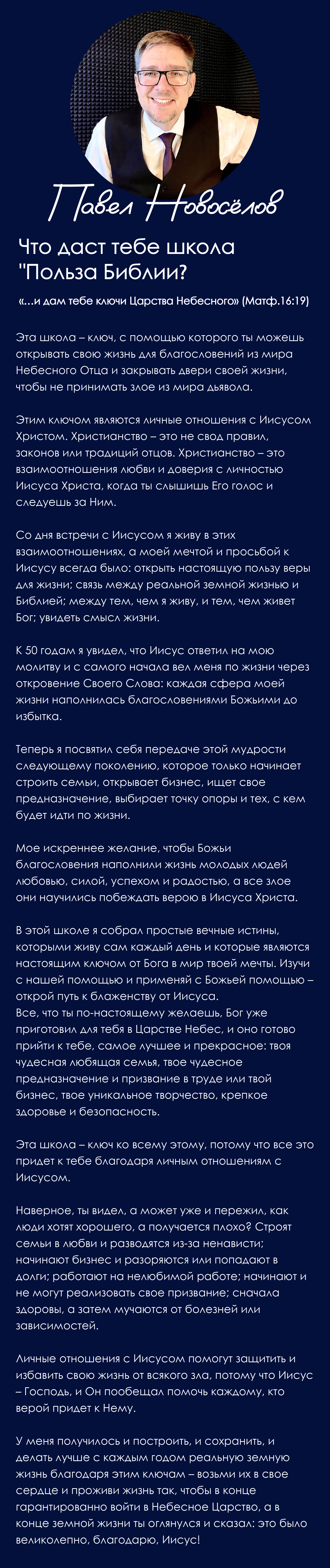 Меня зовут Дмитрий, мне 41 год. Мне очень нравится онлайн школа «Польза Библии», читая план на день я получаю намёки на свою не праведную жизнь). Когда я впервые пришёл познакомился с Павлом, у меня на тот момент не было работы и заканчивались деньги. Мы познакомились, и я рассказал о своей проблеме, мы помолились за то, чтобы я нашёл работу и в моей жизни начали происходить чудеса, в течении двух недель я получил 6 предложений о работе, при том, что ранее у меня были проблемы с законом. Мне теперь нравится изучать Библию, она открывает глаза на многое, а Павел очень понятно рассказывает то, что мне пока не видно.